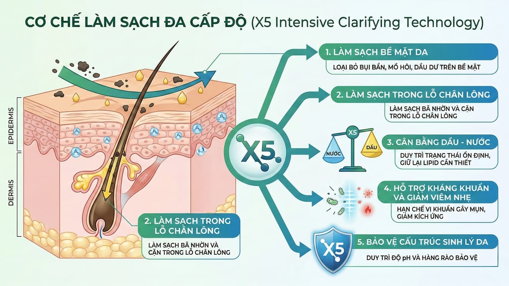 X5 Intensive Clarifying Technology hoạt động theo cơ chế làm sạch đa cấp độ, bao gồm: