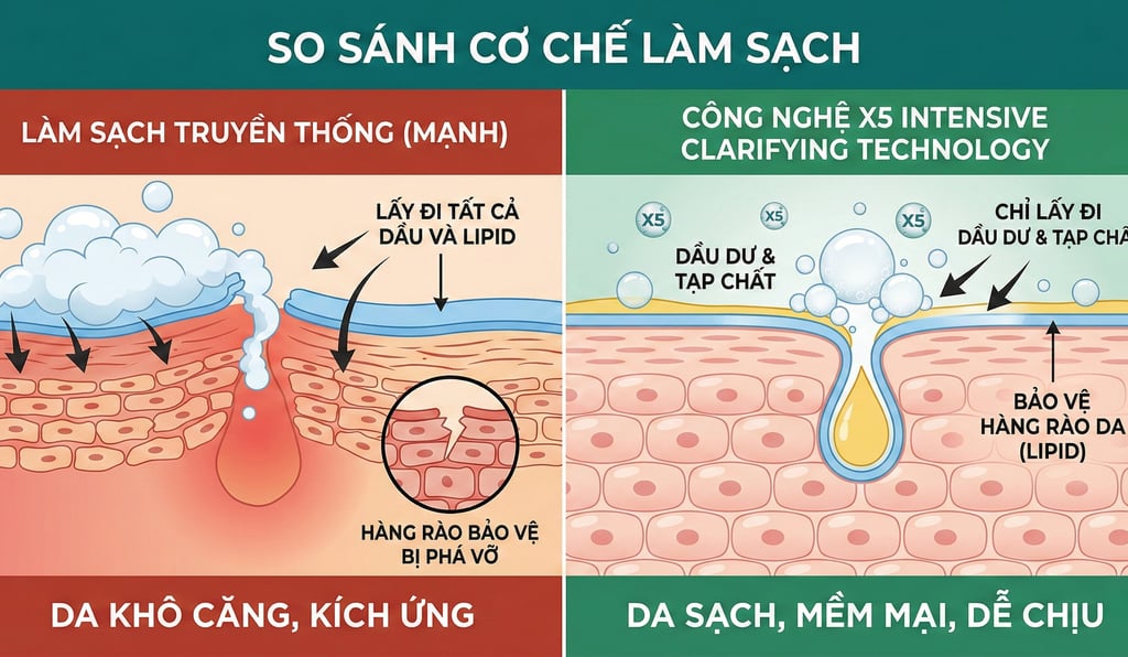 X5 Intensive Clarifying Technology không hướng đến cảm giác sạch mạnh tức thì, mà hướng đến làn da khỏe, ổn định và bền vững, bắt đầu từ bước rửa mặt.