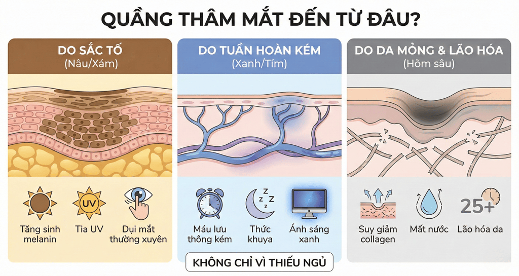 QUẦNG THÂM MẮT ĐẾN TỪ ĐÂU? KHÔNG CHỈ VÌ THIẾU NGỦ