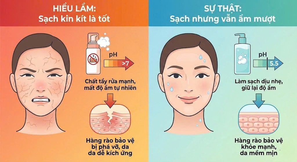 Bài viết này giúp bạn hiểu đúng bản chất của việc rửa mặt và vì sao “sạch gắt” không hề đồng nghĩa với “sạch khỏe”.