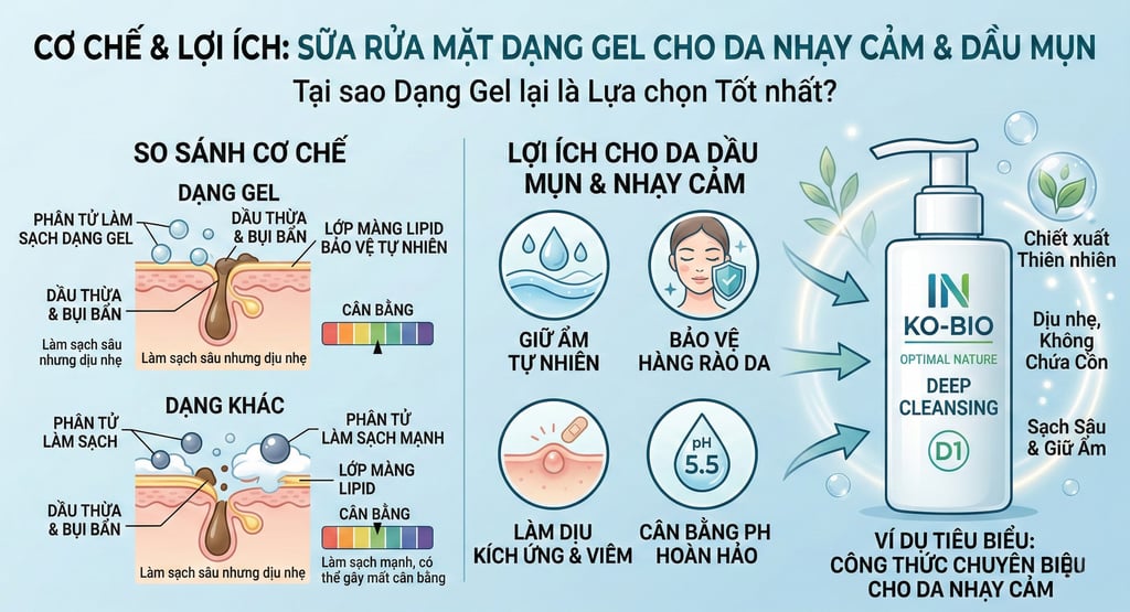 Các sản phẩm gel cleanser dịu nhẹ như IN KO-BIO Optimal Nature Deep Cleansing (D1) được thiết kế chuyên biệt cho nhóm da này.