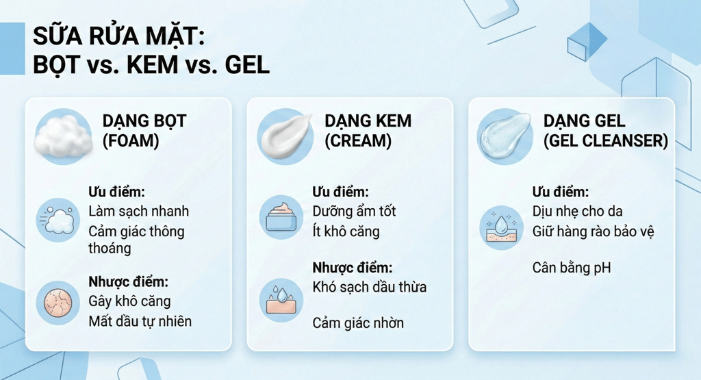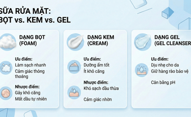 Khi lựa chọn sữa rửa mặt, nhiều người chỉ quan tâm đến thương hiệu hoặc cảm giác sau khi rửa mà ít chú ý đến kết cấu sản phẩm. Trong khi đó, dạng gel, dạng bọt và dạng kem có cơ chế làm sạch rất khác nhau và ảnh hưởng trực tiếp đến tình trạng da, đặc biệt với da dầu mụn và da nhạy cảm.