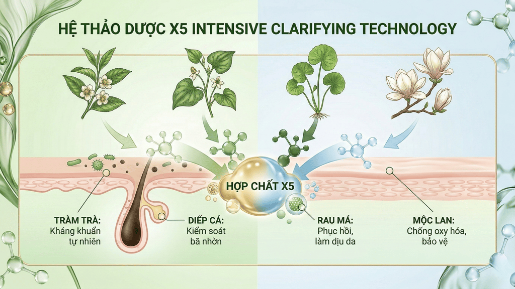 Việc bổ sung các thành phần thảo dược giúp bước rửa mặt không chỉ dừng lại ở làm sạch, mà còn hỗ trợ ổn định da ngay từ đầu, đặc biệt quan trọng với da dầu mụn và da nhạy cảm.