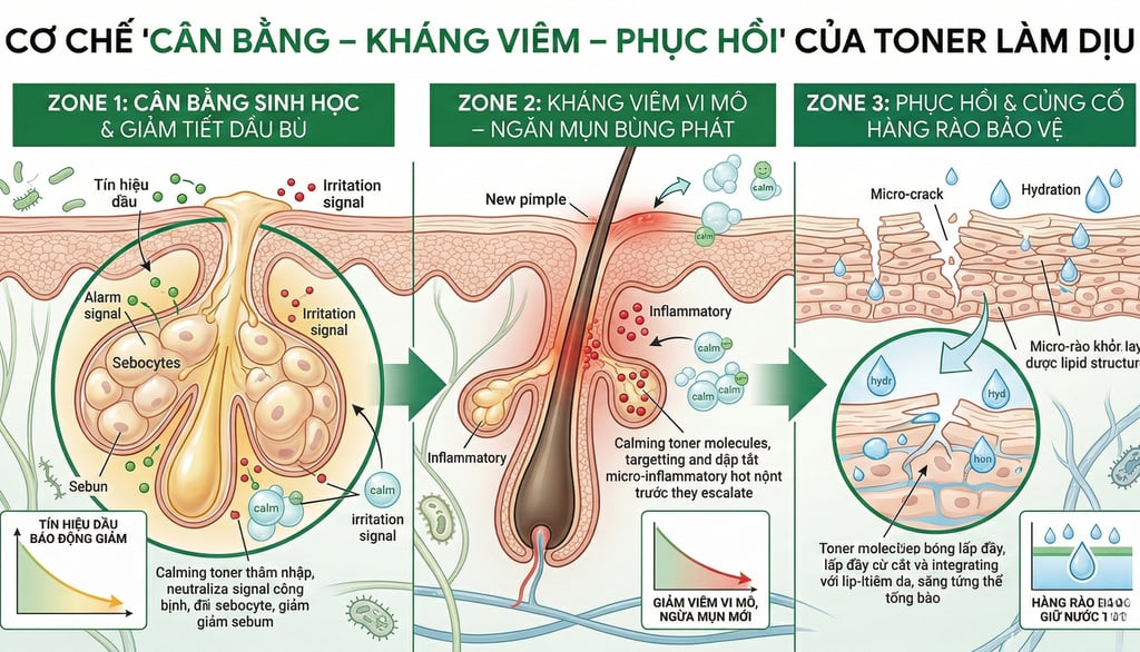 Trên làn da dầu mụn, toner hoạt động thông qua 3 cơ chế cốt lõi: