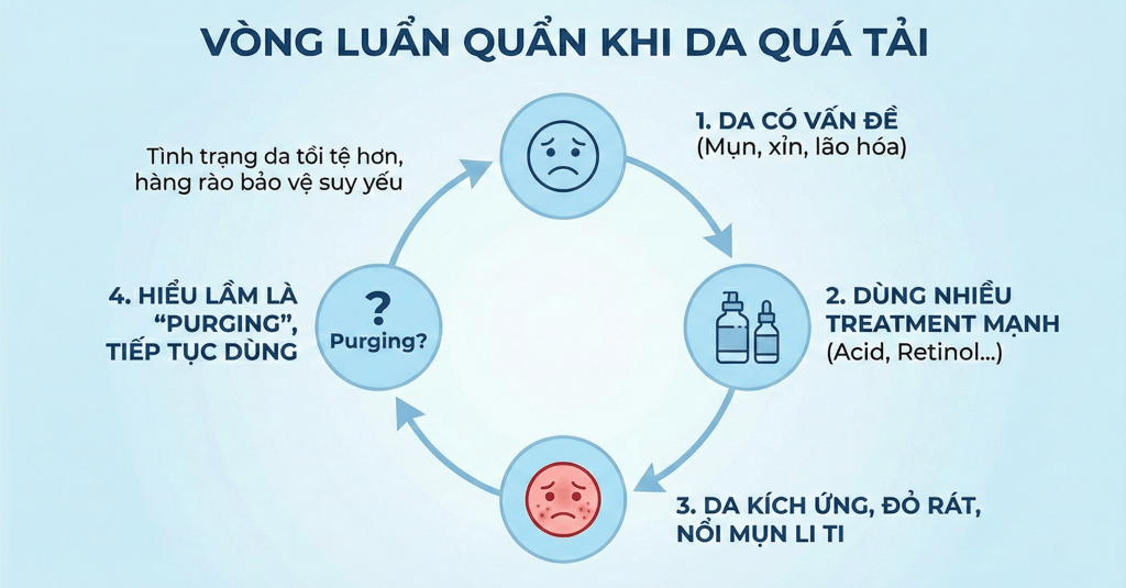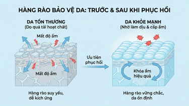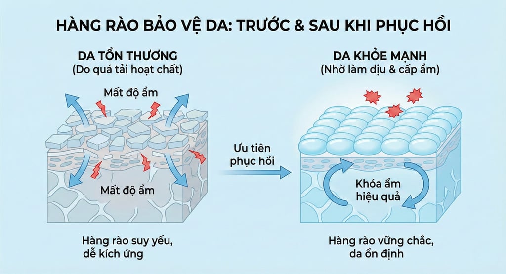 👉 Khi da chưa kịp hồi phục nhưng vẫn bị “ép” tiếp nhận thêm hoạt chất, hàng rào bảo vệ sẽ dần suy yếu.