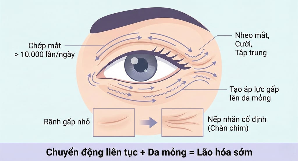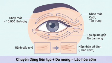 👉 Mỗi chuyển động đều tạo lực gấp lên vùng da mỏng quanh mắt.