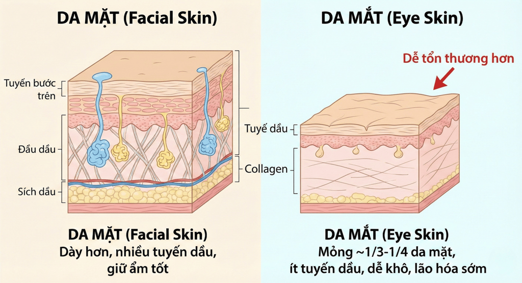 Vậy điều gì khiến vùng da này “yếu ớt” đến vậy? Và vì sao kem mắt không thể dùng chung với kem mặt?